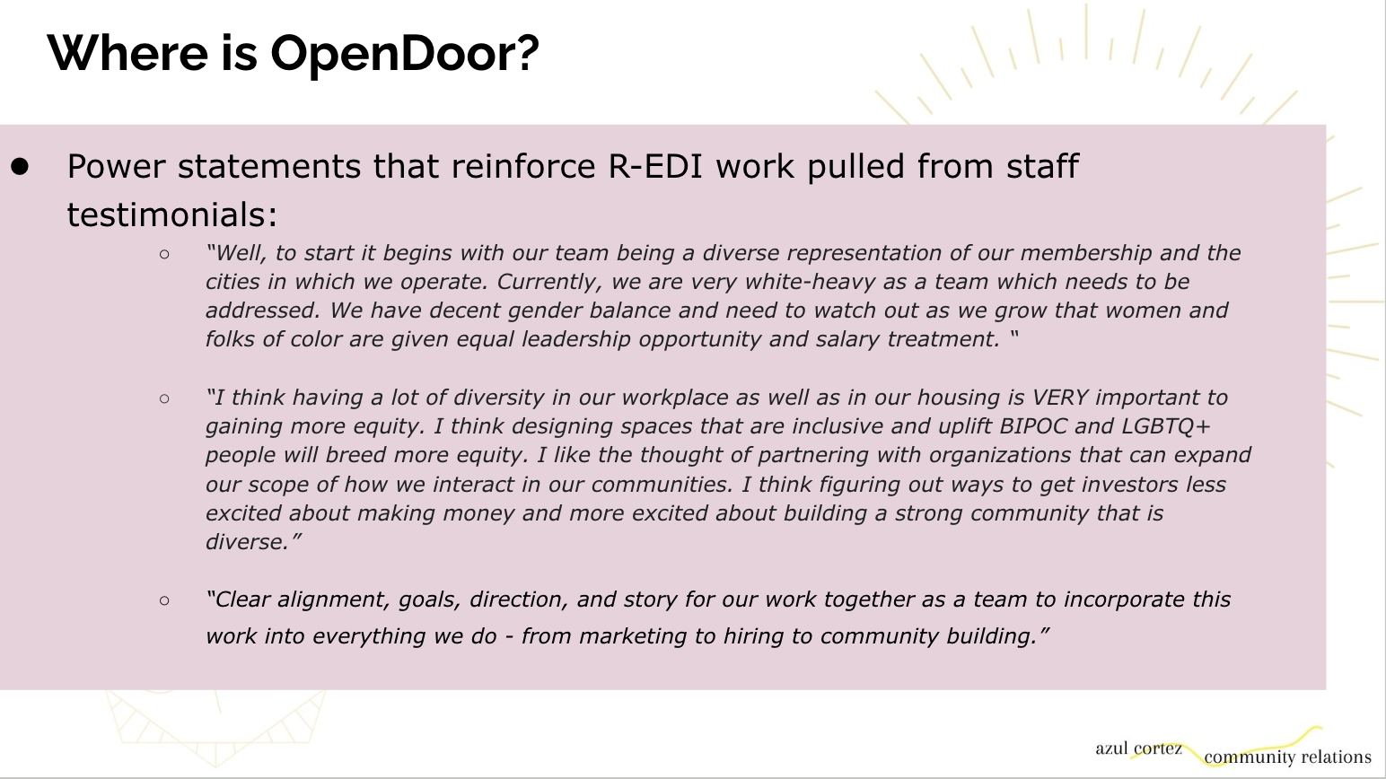 - Advising executive and program leadership on how to embed equity insights into organizational infrastructure, strategy, and public-facing narratives